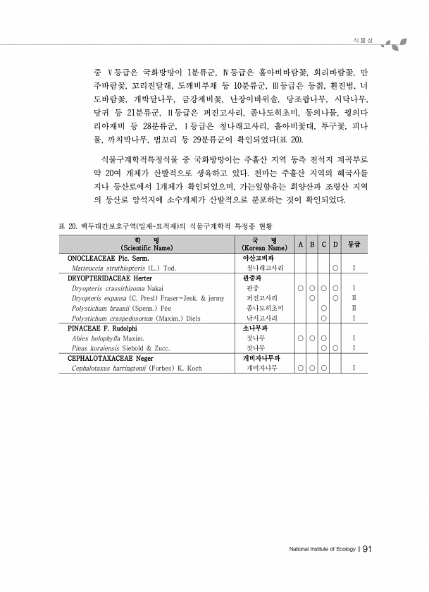 식 물 상 National Institute of EcologyⅠ91 중 Ⅴ등급은 국화방망이 1분류군, Ⅳ등급은 홀아비바람꽃, 회리바람꽃, 만 주바람꽃, 꼬리진달래, 도깨비부채 등 10분류군, Ⅲ등급은 등칡, 흰진범, 너 도바람꽃, 개박달나무, 금강제비꽃, 난장이바위솔, 당조팝나무, 시닥나무, 당귀 등 21분류군, Ⅱ등급은 퍼진고사리, 좀나도히초미, 동의나물, 꿩의다 리아재비 등 28분류군, Ⅰ등급은 청나래고사리, 홀아비꽃대, 투구꽃, 피나 물, 까치박나무, 범꼬리 등 29분류군이 확인되었다 표 20 식물구계학적특정식물 중 국화방망이는 주흘산 지역 동측 전석지 계곡부로 약 20여 개체가 산발적으로 생육하고 있다. 천마는 주흘산 지역의 혜국사를 지나 등산로에서 1개체가 확인되었으며, 가는잎향유는 희양산과 조령...