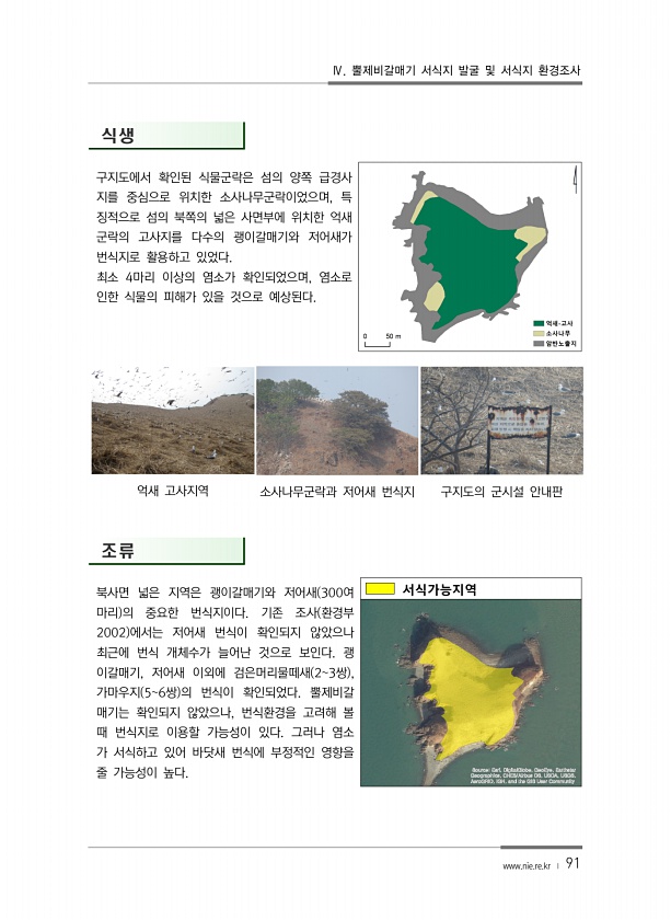 Ⅳ. 뿔제비갈매기 서식지 발굴 및 서식지 환경조사 www.nie.re.kr ? 91 식생 구지도에서 확인된 식물군락은 섬의 양쪽 급경사 지를 중심으로 위치한 소사나무군락이었으며, 특 징적으로 섬의 북쪽의 넓은 사면부에 위치한 억새 군락의 고사지를 다수의 괭이갈매기와 저어새가 번식지로 활용하고 있었다. 최소 4마리 이상의 염소가 확인되었으며, 염소로 인한 식물의 피해가 있을 것으로 예상된다. 억새 고사지역 소사나무군락과 저어새 번식지 구지도의 군시설 안내판 조류 북사면 넓은 지역은 괭이갈매기와 저어새 300여 마리 의 중요한 번식지이다. 기존 조사 환경부 2002 에서는 저어새 번식이 확인되지 않았으나 최근에 번식 개체수가 늘어난 것으로 보인다. 괭 이갈매기, 저어새 이외에 검은머리물떼새 23쌍 , 가마우지 ...