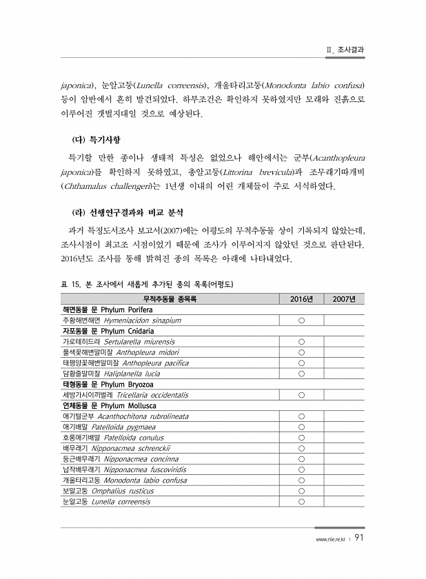 Ⅱ. 조사결과 www.nie.re.kr ? 91 무척추동물 종목록 2016년 2007년 해면동물 문 Phylum Porifera 주황해변해면 Hymeniacidon sinapium ○ 자포동물 문 Phylum Cnidaria 가로테히드라 Sertularella miurensis ○ 풀색꽃해변말미잘 Anthopleura midori ○ 태평양꽃해변말미잘 Anthopleura pacifica ○ 담황줄말미잘 Haliplanella lucia ○ 태형동물 문 Phylum Bryozoa 세방가시이끼벌레 Tricellaria occidentalis ○ 연체동물 문 Phylum Mollusca 애기털군부 Acanthochitona rubrolineata ○ 애기배말 Patelloida pygmaea ○ 호롱애기배말 P...