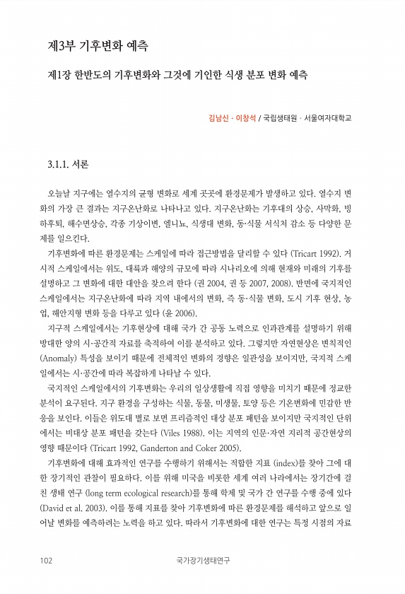 102 국가장기생태연구 제3부 기후변화 예측 제1장 한반도의 기후변화와 그것에 기인한 식생 분포 변화 예측 김남신ㆍ이창석 국립생태원ㆍ서울여자대학교 3.1.1. 서론 오늘날 지구에는 열수지의 균형 변화로 세계 곳곳에 환경문제가 발생하고 있다. 열수지 변 화의 가장 큰 결과는 지구온난화로 나타나고 있다. 지구온난화는 기후대의 상승, 사막화, 빙 하후퇴, 해수면상승, 각종 기상이변, 엘니뇨, 식생대 변화, 동·식물 서식처 감소 등 다양한 문 제를 일으킨다. 기후변화에 따른 환경문제는 스케일에 따라 접근방법을 달리할 수 있다 Tricart 1992 거 시적 스케일에서는 위도, 대륙과 해양의 규모에 따라 시나리오에 의해 현재와 미래의 기후를 설명하고 그 변화에 대한 대안을 찾으려 한다 권 2004, 권 등 2007,...