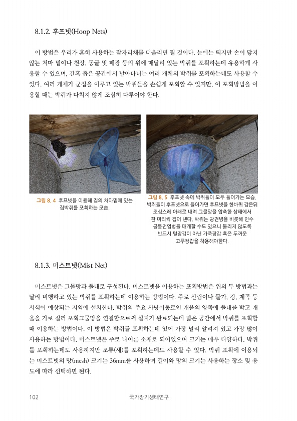 102 국가장기생태연구 8.1.2. 후프넷 Hoop Nets 이 방법은 우리가 흔히 사용하는 잠자리채를 떠올리면 될 것이다. 눈에는 띄지만 손이 닿지 않는 처마 밑이나 천장, 동굴 및 폐광 등의 위에 매달려 있는 박쥐를 포획하는데 유용하게 사 용할 수 있으며, 간혹 좁은 공간에서 날아다니는 여러 개체의 박쥐를 포획하는데도 사용할 수 있다. 여러 개체가 군집을 이루고 있는 박쥐들을 손쉽게 포획할 수 있지만, 이 포획방법을 이 용할 때는 박쥐가 다치지 않게 조심히 다루어야 한다. 8.1.3. 미스트넷 Mist Net 미스트넷은 그물망과 폴대로 구성된다. 미스트넷을 이용하는 포획방법은 위의 두 방법과는 달리 비행하고 있는 박쥐를 포획하는데 이용하는 방법이다. 주로 산림이나 물가, 강, 계곡 등 서식이 예상되는 지...