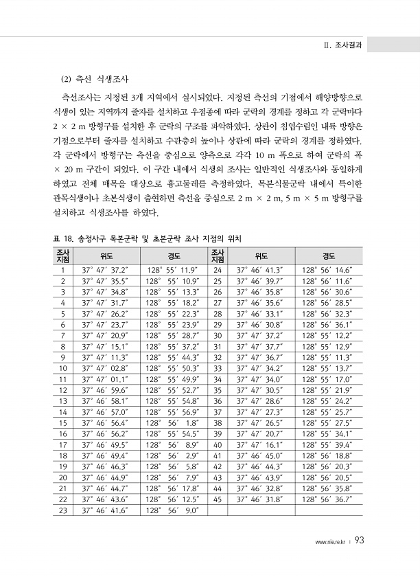 Ⅱ. 조사결과 www.nie.re.kr ? 93 2 측선 식생조사 측선조사는 지정된 3개 지역에서 실시되었다. 지정된 측선의 기점에서 해양방향으로 식생이 있는 지역까지 줄자를 설치하고 우점종에 따라 군락의 경계를 정하고 각 군락마다 2 × 2 m 방형구를 설치한 후 군락의 구조를 파악하였다. 상관이 침엽수림인 내륙 방향은 기점으로부터 줄자를 설치하고 수관층의 높이나 상관에 따라 군락의 경계를 정하였다. 각 군락에서 방형구는 측선을 중심으로 양측으로 각각 10 m 폭으로 하여 군락의 폭 × 20 m 구간이 되었다. 이 구간 내에서 식생의 조사는 일반적인 식생조사와 동일하게 하였고 전체 매목을 대상으로 흉고둘레를 측정하였다. 목본식물군락 내에서 특이한 관목식생이나 초본식생이 출현하면 측선을 중심으로 2 m × ...