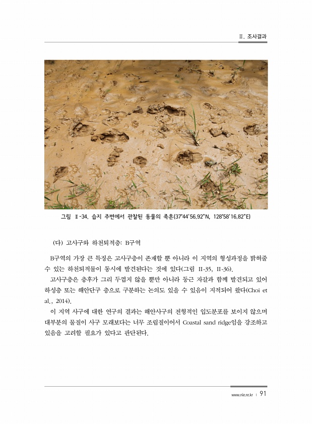 Ⅱ. 조사결과 www.nie.re.kr ? 91 그림 Ⅱ-34. 습지 주변에서 관찰된 동물의 족흔 37°4456.92N, 128°5816.82E 다 고사구와 하천퇴적층B구역 B구역의 가장 큰 특징은 고사구층이 존재할 뿐 아니라 이 지역의 형성과정을 밝혀줄 수 있는 하천퇴적물이 동시에 발견된다는 것에 있다 그림 Ⅱ-35, Ⅱ-36 고사구층은 층후가 그리 두껍지 않을 뿐만 아니라 둥근 자갈과 함께 발견되고 있어 하성층 또는 해안단구 층으로 구분하는 논의도 있을 수 있음이 지적되어 왔다 Choi et al., 2014 이 지역 사구에 대한 연구의 결과는 해안사구의 전형적인 입도분포를 보이지 않으며 대부분의 물질이 사구 모래보다는 너무 조립질이어서 Coastal sand ridge임을 강조하고 있음을 고려할 필요가...