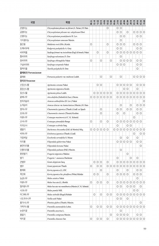 99 큰괭이눈 Chrysosplenium pilosum var. fulvum A. Terracc. H. Hara ○ ○ ○ 금괭이눈 Chrysosplenium pilosum var. valepilosum Ohwi ○ ○ ○ ○ ○ ○ ○ 선괭이눈 Chrysosplenium pseudofauriei H. Lev. ○ ○ ○ ○ 가지괭이눈 Chrysosplenium ramosum Maxim. ○ 돌단풍 Mukdenia rosii Oliv. Koidz. ○ ○ ○ ○ ○ ○ ○ ○ 도깨비부채 Rodgersia podophylla A. Gray ○ ○ ○ ○ 바위떡풀 Saxifraga fortunei var. incisolobata Engl. & Irmsch. Nakai ○ ○ ○ ○ ○ ○ ○ ○ ○ ○ 톱바위취...