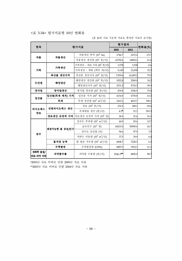 88 항목 평가지표 평가결과 변화율 % 2003 2012 작물 작물생산 작물생산 면적 103 ha 1746.7 1472.4 -15.7 작물생산 생산량 103 톤/년 16792.6 14850.2 -11.6 가축 가축생산 가축생산 육류, 우유 103 톤/년 3,578 3,558 -0.6 가축생산 계란 백만 개/년 9,145 12,090 32.2 축산물 생산가치 축산물 생산가치 109 원/년 7,959.6 14,289.2 79.5 수산업 해양생산 해양생산 생산량 103 톤/년 1922.8 2580.0 34.2 해양생산가치 109 원/년 3571.5 5710.3 59.9 양식업 양식업생산 양식업 생산량 103 톤/년 839.8 1506.9 79.4 임산물 임산물 목재 제외 가치 임산물 가치 109 원/년 4136....
