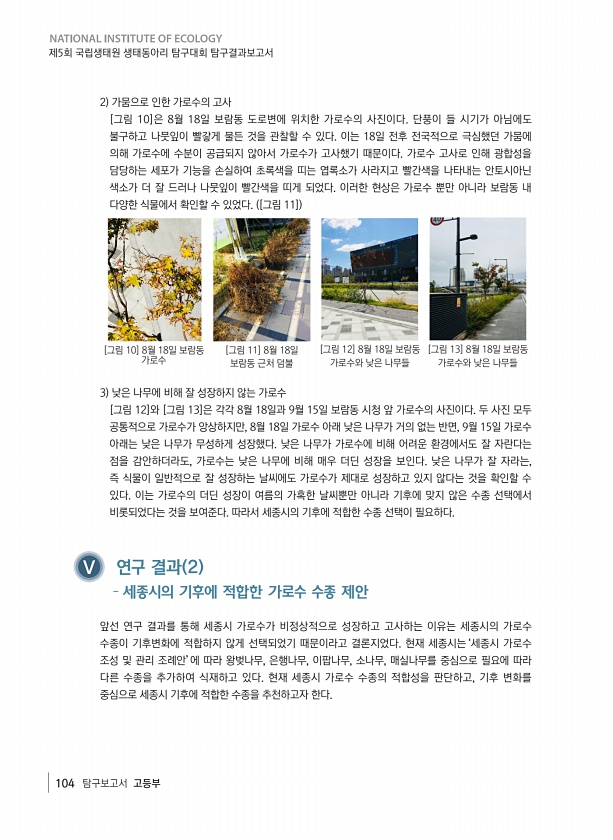 104 탐구보고서 고등부 제5회 국립생태원 생태동아리 탐구대회 탐구결과보고서 2 가뭄으로 인한 가로수의 고사 [그림 10]은 8월 18일 보람동 도로변에 위치한 가로수의 사진이다. 단풍이 들 시기가 아님에도 불구하고 나뭇잎이 빨갛게 물든 것을 관찰할 수 있다. 이는 18일 전후 전국적으로 극심했던 가뭄에 의해 가로수에 수분이 공급되지 않아서 가로수가 고사했기 때문이다. 가로수 고사로 인해 광합성을 담당하는 세포가 기능을 손실하여 초록색을 띠는 엽록소가 사라지고 빨간색을 나타내는 안토시아닌 색소가 더 잘 드러나 나뭇잎이 빨간색을 띠게 되었다. 이러한 현상은 가로수 뿐만 아니라 보람동 내 다양한 식물에서 확인할 수 있었다. [그림 11] [그림 10] 8월 18일 보람동 가로수 [그림 11] 8월 18일 보람동...
