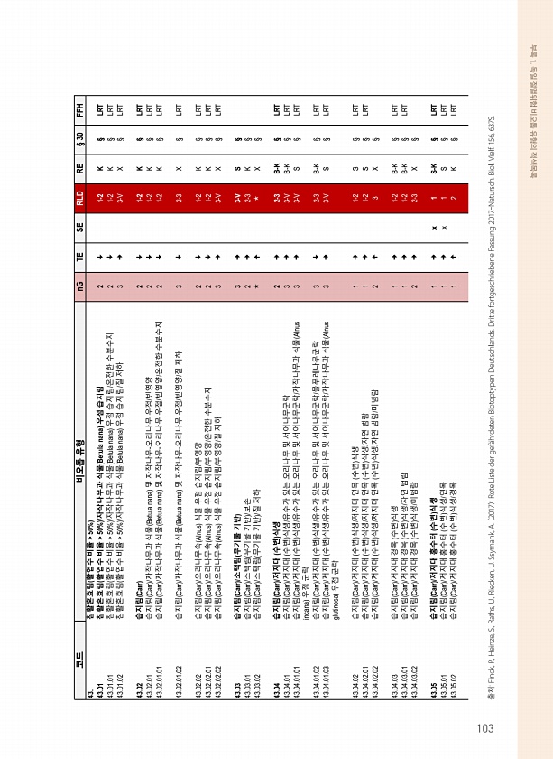 부록 1. 독일 절멸위험 비오톱 유형의 적색목록 출처Finck, P., Heinze, S., Raths, U., Riecken, U. Ssymank, A. 2017 Rote Liste der gef?hrdeten Biotoptypen Deutschlands. Dritte fortgeschriebene Fassung 2017.-Natursch. Biol. Vielf. 156, 637S. 코드 비오톱 유형 nG TE SE RLD RE § 30 FFH 43. 침활혼효림 활엽수 비율 50% 43.01 침활혼효림 활엽수 비율 50% /자작나무과 식물 Betula nana 우점 습지림 2 ? 1-2 K § LRT 43.01.01 침활혼효림 활엽수 비율 50% /자작나무과 식물 Betula nana 우점 습지림/온전한 ...
