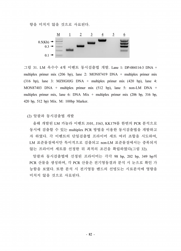 82 31. LM 4 Lane 1DP-004114-3 DNA + multiplex primer mix 206 bp , lane 2MON87419 DNA + multiplex primer mix 316 bp , lane 3MZHG0JG DNA + multiplex primer mix 420 bp , lane 4MON87403 DNA + multiplex primer mix 512 bp , lane 5non-LM DNA + multiplex primer mix, lane 6DNA Mix + multiplex primer mix 206 bp, 316 bp, 420 bp, 512 bp Mix. M100bp Marker. 2 LM J101, J163, KK179 PCR multiplex PCR , LM non-LM ...