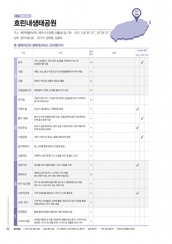 No. 제주- 제주 046 본 생태자산의 생태계서비스 간이평가지 구분 예시 평가 등급 설명 규모별 혜택 지점 지역 국가 공급 담수 식수, 농업용수, 축산 용수 등 물을 저장하여 식수 및 농업용수를 제공 ++ √ 식량 곡물, 과실, 물고기 등 인간 및 야생동물에게 먹거리 제공 + 자원 목재나 약재 등 상품의 재료로 활용 0 친환경에너지 태양열이나 풍력, 조력을 통해 전기 생산 0 조절 대기질 자동차 배기가스, 산업체 대기오염, 농업발생 먼지, 미세먼지 등 대기오염 감소 0 기후조절 온실가스를 줄이고 기후변화 완화 + √ 홍수 재해 홍수로 인한 범람에 대한 조절, 집중강우에 대한 조절 폭우로 인한 홍수피해 저감 + √ 토양유실 토양 소실을 방어하는 밀도 높은 식생의 존재, 비와 바람으로 인한 토양유실 완화, +...