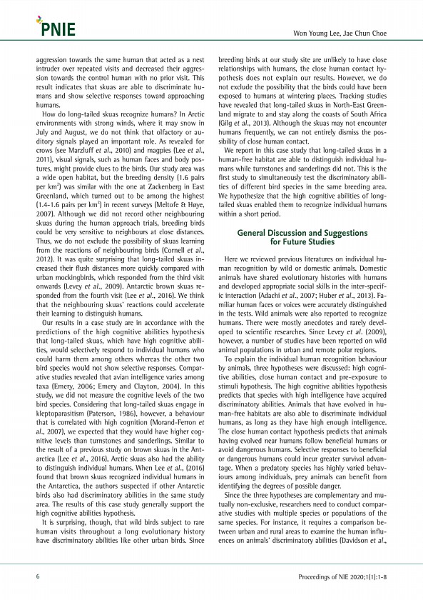 Won Young Lee, Jae Chun Choe 6 Proceedings of NIE 2020;1 1 1-8 aggression towards the same human that acted as a nest intruder over repeated visits and decreased their aggression towards the control human with no prior visit. This result indicates that skuas are able to discriminate humans and show selective responses toward approaching humans. How do long-tailed skuas recognize humans? In Arctic ...