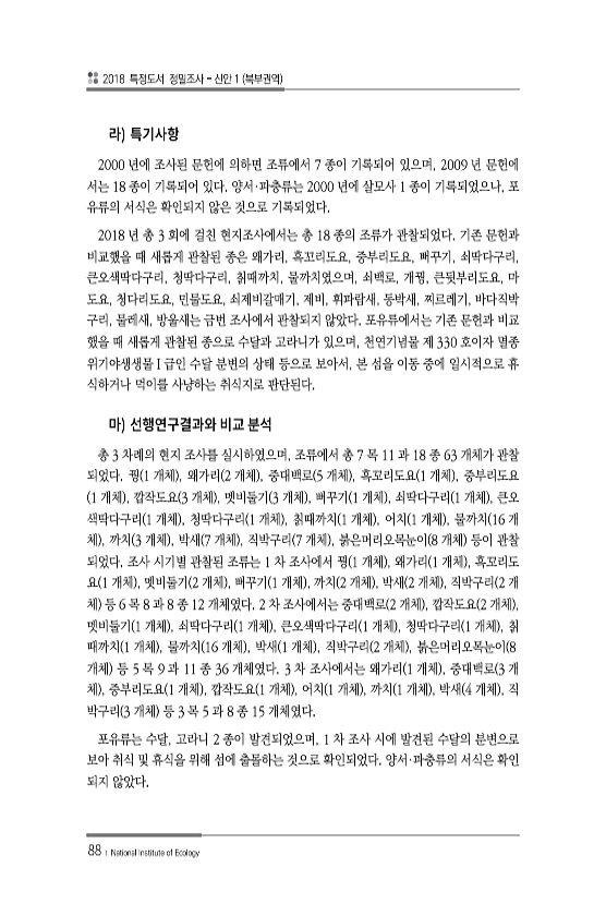 2018 특정도서 정밀조사 신안 1 북부권역 88 ? National Institute of Ecology 2000 년에 조사된 문헌에 의하면 조류에서 7 종이 기록되어 있으며, 2009 년 문헌에 서는 18 종이 기록되어 있다. 양서·파충류는 2000 년에 살모사 1 종이 기록되었으나, 포 유류의 서식은 확인되지 않은 것으로 기록되었다. 2018 년 총 3 회에 걸친 현지조사에서는 총 18 종의 조류가 관찰되었다. 기존 문헌과 비교했을 때 새롭게 관찰된 종은 왜가리, 흑꼬리도요, 중부리도요, 뻐꾸기, 쇠딱다구리, 큰오색딱다구리, 청딱다구리, 칡때까치, 물까치였으며, 쇠백로, 개꿩, 큰뒷부리도요, 마 도요, 청다리도요, 민물도요, 쇠제비갈매기, 제비, 휘파람새, 동박새, 찌르레기, 바다직박 구리, 물레새, ...
