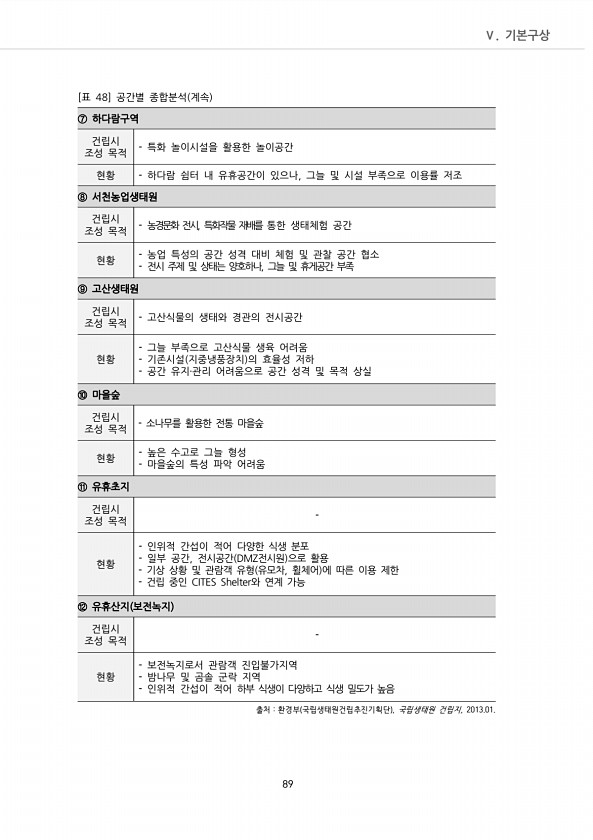 Ⅴ. 기본구상 89 ⑦ 하다람구역 건립시 조성 목적 특화 놀이시설을 활용한 놀이공간 현황 하다람 쉼터 내 유휴공간이 있으나, 그늘 및 시설 부족으로 이용률 저조 ⑧ 서천농업생태원 건립시 조성 목적 농경문화 전시, 특화작물 재배를 통한 생태체험 공간 현황 농업 전시 주제 특성의 및 상태는 공간 성격 양호하나 대비 , 그늘 체험 및 및 휴게공간 관찰 공간 부족 협소 ⑨ 고산생태원 건립시 조성 목적 고산식물의 생태와 경관의 전시공간 현황 그늘 부족으로 고산식물 생육 어려움 기존시설 지중냉풍장치 의 효율성 저하 공간 유지·관리 어려움으로 공간 성격 및 목적 상실 ⑩ 마을숲 건립시 조성 목적 소나무를 활용한 전통 마을숲 현황 높은 마을숲의 수고로 특성 그늘 파악 형성 어려움 ⑪ 유휴초지 건립시 조성 목적 현황 인위적...