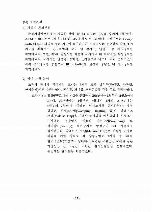 55 다 서식환경 1 서식지 환경분석 국토지리정보원에서 제공한 설악 388144 격자의 125000 수치지도를 활용, ArcMap 10.1 프로그램을 사용해 GIS 분석을 실시하였다. 조사경로는 Google earth 내 kmz 파일을 통해 지도에 표기하였다. 수치지도의 등고선을 활용, TIN 지도를 제작하고 연구지역의 고도 및 경사도, 단면도 등 지리정보를 파악하였다. 또한, 제5차 임상도를 이용해 조사지역 내 대략적인 식생정보를 파악하였다. 조사지는 단목령, 곰배령, 산지늪으로 나누어 비교 분석하였고 각각 조사경로를 중심으로 100m buffer를 설정해 영향권 내 지리정보를 파악하였다. 2 먹이 자원 분석 조류의 잠재적 먹이자원 조사는 3개의 조사 방형구 곰배령, 단목령, 산지습지 에서 수행하였다. 곤...