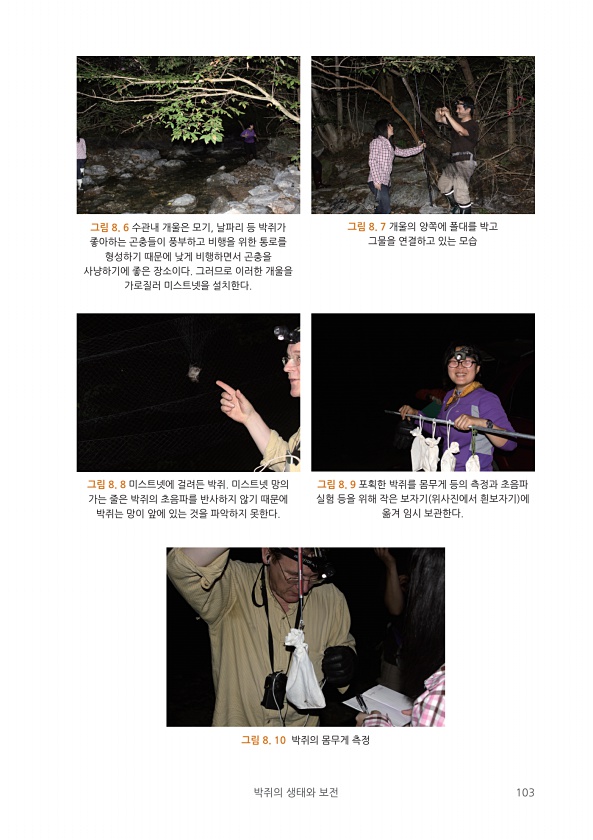 박쥐의 생태와 보전 103 그림 8. 6 수관내 개울은 모기, 날파리 등 박쥐가 좋아하는 곤충들이 풍부하고 비행을 위한 통로를 형성하기 때문에 낮게 비행하면서 곤충을 사냥하기에 좋은 장소이다. 그러므로 이러한 개울을 가로질러 미스트넷을 설치한다. 그림 8. 8 미스트넷에 걸려든 박쥐. 미스트넷 망의 가는 줄은 박쥐의 초음파를 반사하지 않기 때문에 박쥐는 망이 앞에 있는 것을 파악하지 못한다. 그림 8. 7 개울의 양쪽에 폴대를 박고 그물을 연결하고 있는 모습 그림 8. 9 포획한 박쥐를 몸무게 등의 측정과 초음파 실험 등을 위해 작은 보자기 위사진에서 흰보자기 에 옮겨 임시 보관한다. 그림 8. 10 박쥐의 몸무게측정