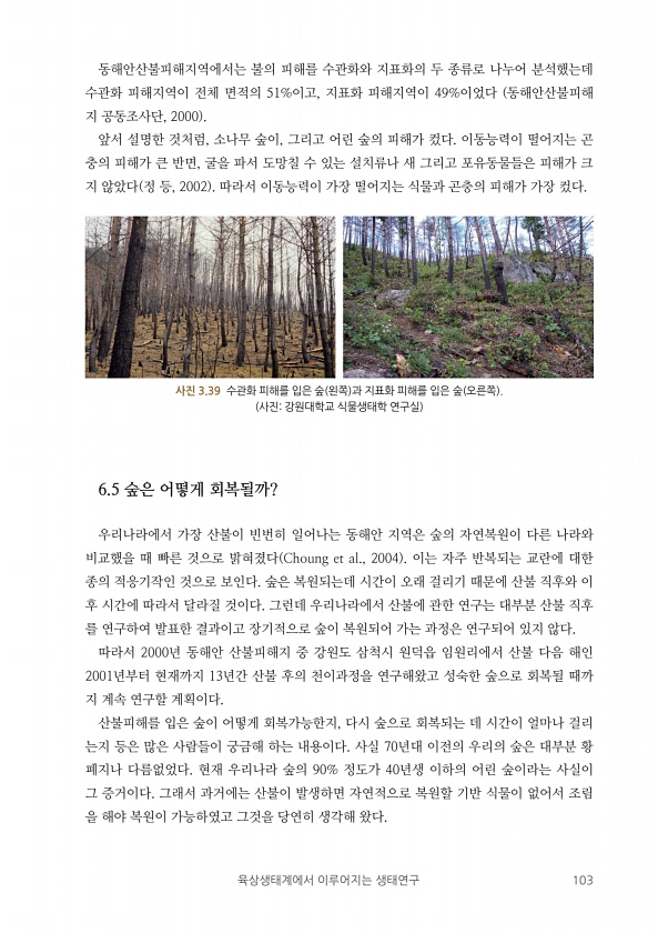 육상생태계에서 이루어지는 생태연구 103 동해안산불피해지역에서는 불의 피해를 수관화와 지표화의 두 종류로 나누어 분석했는데 수관화 피해지역이 전체 면적의 51%이고, 지표화 피해지역이 49%이었다 동해안산불피해 지 공동조사단, 2000 앞서 설명한 것처럼, 소나무 숲이, 그리고 어린 숲의 피해가 컸다. 이동능력이 떨어지는 곤 충의 피해가 큰 반면, 굴을 파서 도망칠 수 있는 설치류나 새 그리고 포유동물들은 피해가 크 지 않았다 정 등, 2002 따라서 이동능력이 가장 떨어지는 식물과 곤충의 피해가 가장 컸다. 6.5 숲은 어떻게 회복될까? 우리나라에서 가장 산불이 빈번히 일어나는 동해안 지역은 숲의 자연복원이 다른 나라와 비교했을 때 빠른 것으로 밝혀졌다 Choung et al., 2004 이는 자주 반복되...