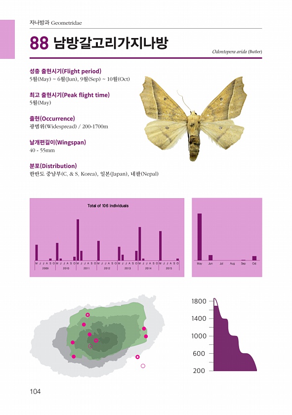 104 자나방과 Geometridae 성충 출현시기 Flight period 5월 May 6월 Jun , 9월 Sep 10월 Oct 최고 출현시기 Peak fight time 5월 May 출현 Occurrence 광범위 Widespread 200-1700m 날개편길이 Wingspan 40 55mm 분포 Distribution 한반도 중남부 C. & S. Korea , 일본 Japan , 네팔 Nepal Odontopera arida Butler M J J A S O M J J A S O M J J A S O M J J A S O M J J A S O M J J A S O M J J A S O May Jun Jul Aug Sep Oct 2009 2010 2011 2012 2013 2014 2015 Total ...