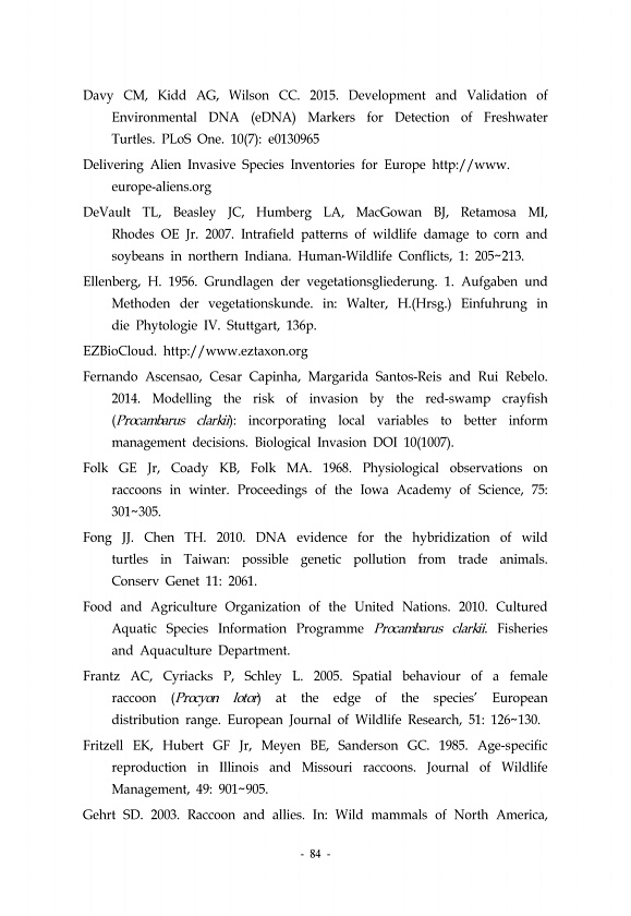 84 Davy CM, Kidd AG, Wilson CC. 2015. Development and Validation of Environmental DNA eDNA Markers for Detection of Freshwater Turtles. PLoS One. 10 7 e0130965 Delivering Alien Invasive Species Inventories for Europe http//www. europe-aliens.org DeVault TL, Beasley JC, Humberg LA, MacGowan BJ, Retamosa MI, Rhodes OE Jr. 2007. Intrafield patterns of wildlife damage to corn and soybeans in northern ...