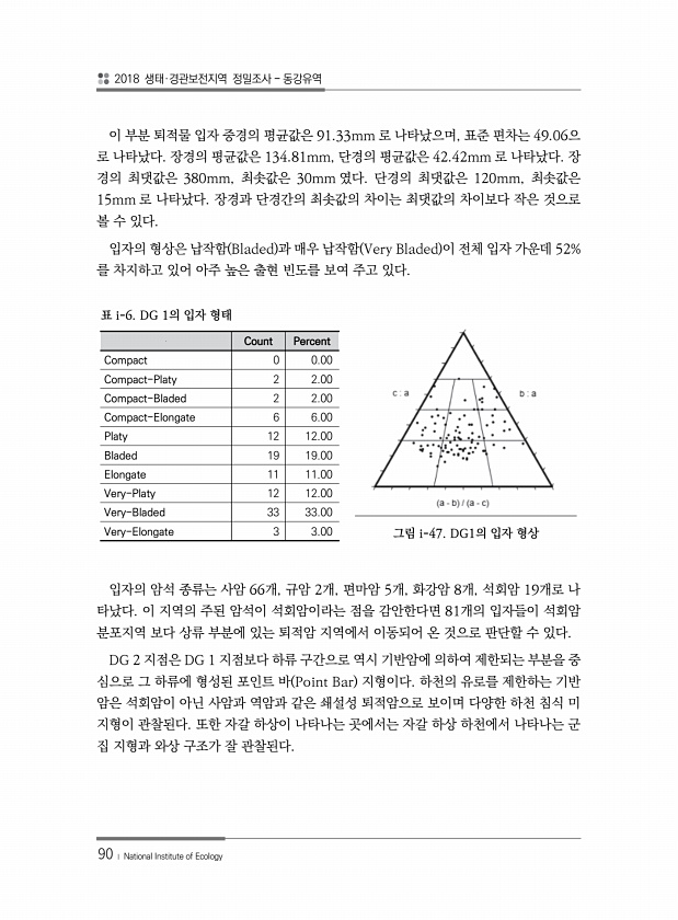 2018 생태·경관보전지역 정밀조사 동강유역 90 ? National Institute of Ecology 이 부분 퇴적물 입자 중경의 평균값은 91.33mm 로 나타났으며, 표준 편차는 49.06으 로 나타났다. 장경의 평균값은 134.81mm, 단경의 평균값은 42.42mm 로 나타났다. 장 경의 최댓값은 380mm, 최솟값은 30mm 였다. 단경의 최댓값은 120mm, 최솟값은 15mm 로 나타났다. 장경과 단경간의 최솟값의 차이는 최댓값의 차이보다 작은 것으로 볼 수 있다. 입자의 형상은 납작함 Bladed 과 매우 납작함 Very Bladed 이 전체 입자 가운데 52% 를 차지하고 있어 아주 높은 출현 빈도를 보여 주고 있다. Count Percent Compact 0 0.00 Compact-Pl...
