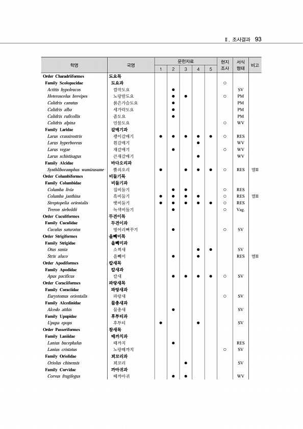 Ⅱ. 조사결과 93 학명 국명 문헌자료 현지 조사 서식 1 2 3 4 5 형태 비고 Order Charadriiformes 도요목 Family Scolopacidae 도요과 ○ Actitis hypoleucos 깝작도요 ● SV Heteroscelus brevipes 노랑발도요 ● ● ○ PM Calidris canutus 붉은가슴도요 ● PM Calidris alba 세가락도요 ● PM Calidris ruficollis 좀도요 ● PM Calidris alpina 민물도요 ○ WV Family Laridae 갈매기과 Larus crassirostris 괭이갈매기 ● ● ● ● ● ○ RES Larus hyperboreus 흰갈매기 ● WV Larus vegae 재갈매기 ● ○ W...