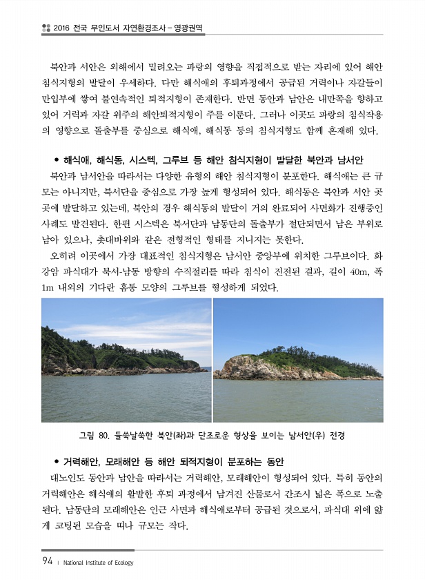 2016 전국 무인도서 자연환경조사 영광권역 94 ? National Institute of Ecology 북안과 서안은 외해에서 밀려오는 파랑의 영향을 직접적으로 받는 자리에 있어 해안 침식지형의 발달이 우세하다. 다만 해식애의 후퇴과정에서 공급된 거력이나 자갈들이 만입부에 쌓여 불연속적인 퇴적지형이 존재한다. 반면 동안과 남안은 내만쪽을 향하고 있어 거력과 자갈 위주의 해안퇴적지형이 주를 이룬다. 그러나 이곳도 파랑의 침식작용 의 영향으로 돌출부를 중심으로 해식애, 해식동 등의 침식지형도 함께 혼재해 있다. ? 해식애, 해식동, 시스텍, 그루브 등 해안 침식지형이 발달한 북안과 남서안 북안과 남서안을 따라서는 다양한 유형의 해안 침식지형이 분포한다. 해식애는 큰 규 모는 아니지만, 북서단을 중심으로 가장...