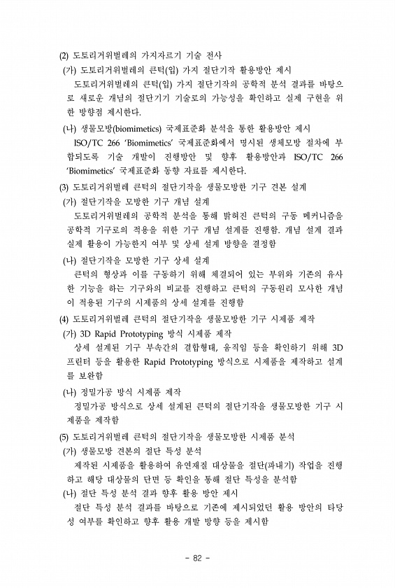 82 2 도토리거위벌레의 가지자르기 기술 전사 가 도토리거위벌레의 큰턱 입 가지 절단기작 활용방안 제시 도토리거위벌레의 큰턱 입 가지 절단기작의 공학적 분석 결과를 바탕으 로 새로운 개념의 절단기기 기술로의 가능성을 확인하고 실제 구현을 위 한 방향점 제시한다. 나 생물모방 biomimetics 국제표준화 분석을 통한 활용방안 제시 ISO/TC 266 ‘Biomimetics’ 국제표준화에서 명시된 생체모방 절차에 부 합되도록 기술 개발이 진행방안 및 향후 활용방안과 ISO/TC 266 ‘Biomimetics’ 국제표준화 동향 자료를 제시한다. 3 도토리거위벌레 큰턱의 절단기작을 생물모방한 기구 견본 설계 가 절단기작을 모방한 기구 개념 설계 도토리거위벌레의 공학적 분석을 통해 밝혀진 큰턱의 구동 메커니즘을 ...