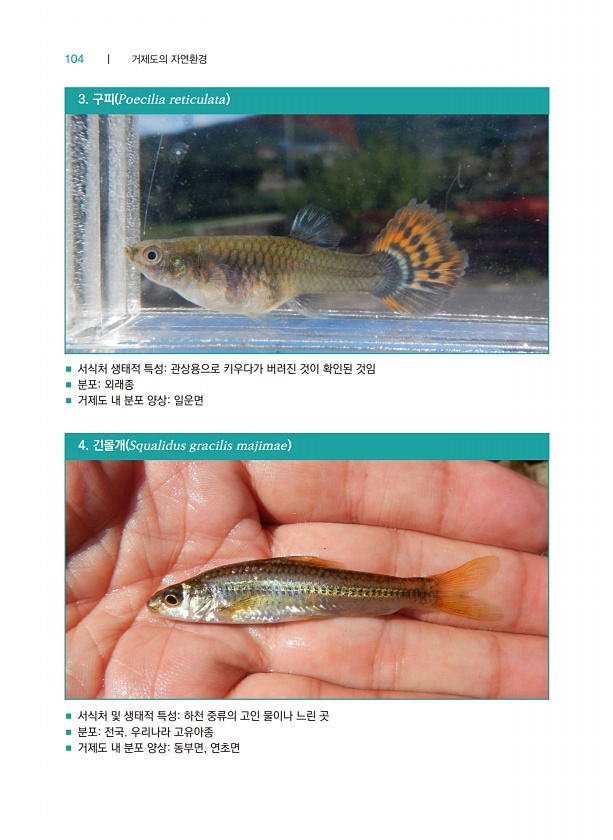 104 ┃ 거제도의 자연환경 ■ 서식처 생태적 특성관상용으로 키우다가 버려진 것이 확인된 것임 ■ 분포외래종 ■ 거제도 내 분포 양상일운면 ■ 서식처 및 생태적 특성하천 중류의 고인 물이나 느린 곳 ■ 분포전국. 우리나라 고유아종 ■ 거제도 내 분포 양상동부면, 연초면 3. 구피 Poecilia reticulata 4. 긴몰개 Squalidus gracilis majimae