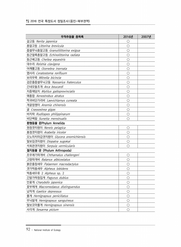 2016 전국 특정도서 정밀조사 옹진-북부권역 92 ? National Institute of Ecology 무척추동물 종목록 2016년 2007년 갈고둥 Nerita japonica ○ 총알고둥 Littorina brevicula ○ 좁쌀무늬총알고둥 Granulilittorina exigua ○ 둥근얼룩총알고둥 Echinolittorina radiata ○ 둥근배고둥 Cheilea equestris ○ 대수리 Reishia clavigera ○ 어깨뿔고둥 Ocenebra inornata ○ 맵사리 Ceratostoma rorifluum ○ 보리무륵 Mitrella bicincta ○ 검은줄좁쌀무늬고둥 Nassarius fraterculus ○ 긴네모돌조개 Arca boucardi ○ 지중해담치 Mytilu...