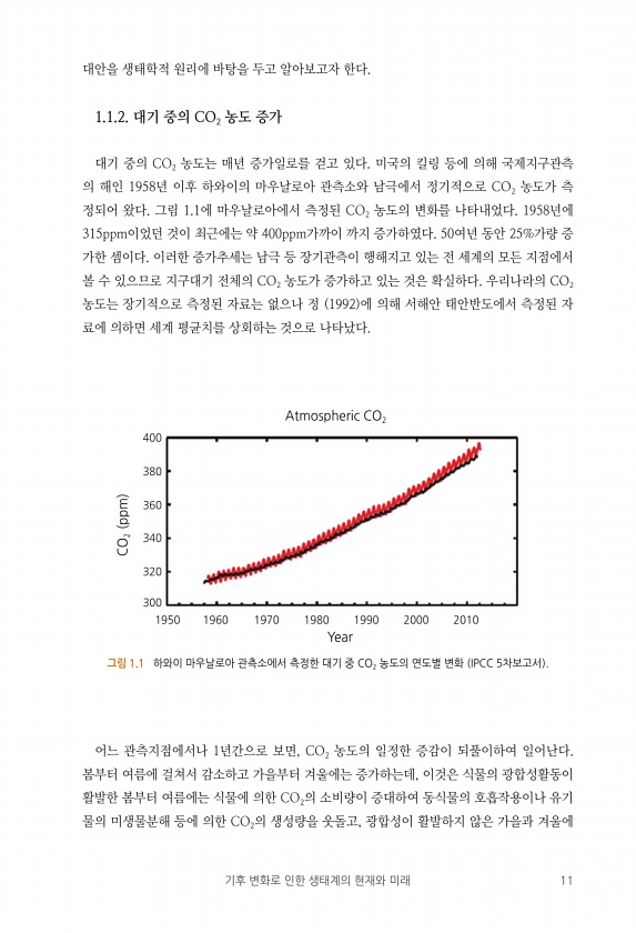 기후 변화로 인한 생태계의 현재와 미래 11 대안을 생태학적 원리에 바탕을 두고 알아보고자 한다. 1.1.2. 대기 중의 CO2 농도 증가 대기 중의 CO2 농도는 매년 증가일로를 걷고 있다. 미국의 킬링 등에 의해 국제지구관측 의 해인 1958년 이후 하와이의 마우날로아 관측소와 남극에서 정기적으로 CO2 농도가 측 정되어 왔다. 그림 1.1에 마우날로아에서 측정된 CO2 농도의 변화를 나타내었다. 1958년에 315ppm이었던 것이 최근에는 약 400ppm가까이 까지 증가하였다. 50여년 동안 25%가량 증 가한 셈이다. 이러한 증가추세는 남극 등 장기관측이 행해지고 있는 전 세계의 모든 지점에서 볼 수 있으므로 지구대기 전체의 CO2 농도가 증가하고 있는 것은 확실하다. 우리나라의 CO2 농도는 장기적...