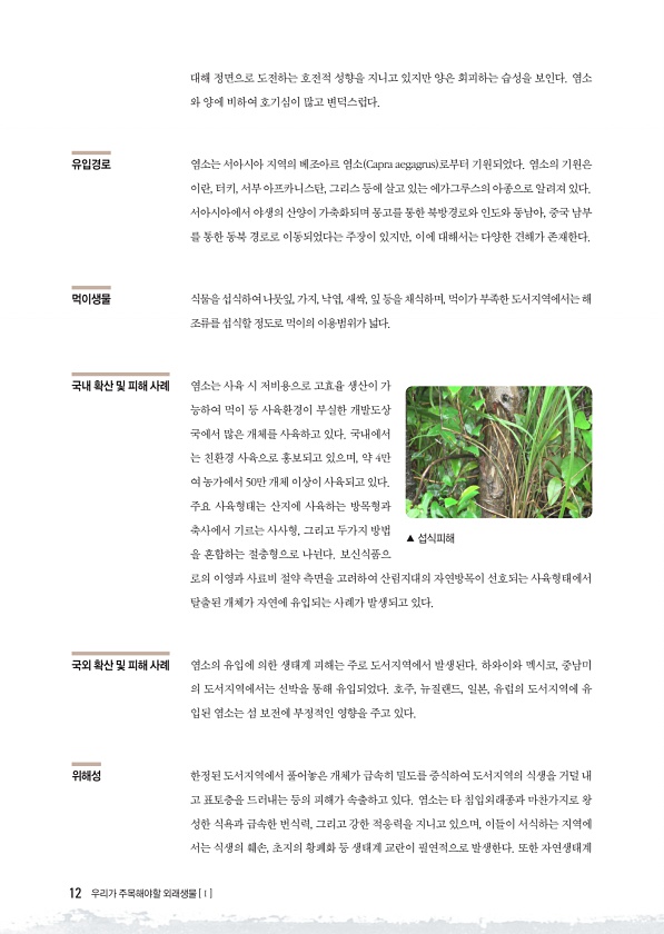 12 우리가 주목해야할 외래생물 [Ⅰ] 대해 정면으로 도전하는 호전적 성향을 지니고 있지만 양은 회피하는 습성을 보인다. 염소 와 양에 비하여 호기심이 많고 변덕스럽다. 유입경로 염소는 서아시아 지역의 베조아르 염소 Capra aegagrus 로부터 기원되었다. 염소의 기원은 이란, 터키, 서부 아프카니스탄, 그리스 등에 살고 있는 에가그루스의 아종으로 알려져 있다. 서아시아에서 야생의 산양이 가축화되며 몽고를 통한 북방경로와 인도와 동남아, 중국 남부 를 통한 동북 경로로 이동되었다는 주장이 있지만, 이에 대해서는 다양한 견해가 존재한다. 먹이생물 식물을 섭식하여 나뭇잎, 가지, 낙엽, 새싹, 잎 등을 채식하며, 먹이가 부족한 도서지역에서는 해 조류를 섭식할 정도로 먹이의 이용범위가 넓다. 국내 확산 및 ...
