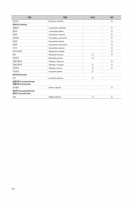 102 큰입배스 Micropterus salmoides ○ 망둑어과 Gobiidae 점줄망둑 Acentrogobius pellidebilis ○ 줄망둑 Acentrogobius pfaumi ○ 점망둑 Chaenogobius annularis ○ 날개망둑 Favonigobius gymnauchen ○ 날망둑 Gymnogobius breunigii ○ 살망둑 Gymnogobius heptacanthus ○ 꾹저구 Gymnogobius urotaenia ○ 제주모치망둑 Mugilogobius fontinalis ○ 밀어 Rhinogobius brunneus ○ ○ 갈문망둑 Rhinogobius giurinus ○ 민물두줄망둑 Tridentiger bifasciatus ○ 민물검정망둑 Tridentiger brev...