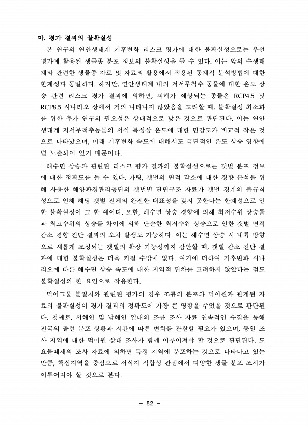 82 마. 평가 결과의 불확실성 본 연구의 연안생태계 기후변화 리스크 평가에 대한 불확실성으로는 우선 평가에 활용된 생물종 분포 정보의 불확실성을 들 수 있다. 이는 앞의 수생태 계와 관련한 생물종 자료 및 자료의 활용에서 적용된 통계적 분석방법에 대한 한계성과 동일하다. 하지만, 연안생태계 내의 저서무척추 동물에 대한 온도 상 승 관련 리스크 평가 결과에 의하면, 피해가 예상되는 종들은 RCP4.5 및 RCP8.5 시나리오 상에서 거의 나타나지 않았음을 고려할 때, 불확실성 최소화 를 위한 추가 연구의 필요성은 상대적으로 낮은 것으로 판단된다. 이는 연안 생태계 저서무척추동물의 서식 특성상 온도에 대한 민감도가 비교적 작은 것 으로 나타났으며, 미래 기후변화 속도에 대해서도 극단적인 온도 상승 영향에 덜 ...