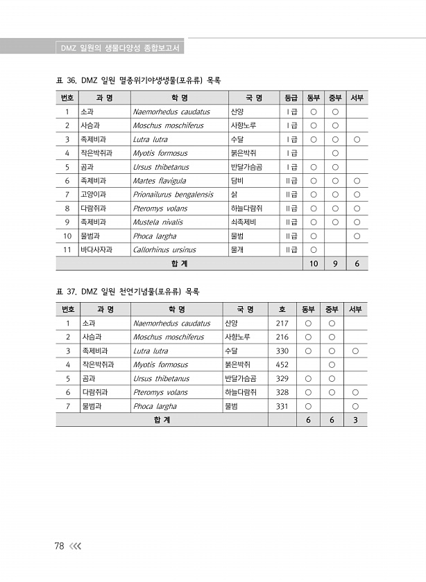 DMZ 일원의 생물다양성 종합보고서 78 번호 과 명 학 명 국 명 등급 동부 중부 서부 1 소과 Naemorhedus caudatus 산양 Ⅰ급 ○ ○ 2 사슴과 Moschus moschiferus 사향노루 Ⅰ급 ○ ○ 3 족제비과 Lutra lutra 수달 Ⅰ급 ○ ○ ○ 4 작은박쥐과 Myotis formosus 붉은박쥐 Ⅰ급 ○ 5 곰과 Ursus thibetanus 반달가슴곰 Ⅰ급 ○ ○ 6 족제비과 Martes flavigula 담비 Ⅱ급 ○ ○ ○ 7 고양이과 Prionailurus bengalensis 삵 Ⅱ급 ○ ○ ○ 8 다람쥐과 Pteromys volans 하늘다람쥐 Ⅱ급 ○ ○ ○ 9 족제비과 Mustela nivalis 쇠족제비 Ⅱ급 ○ ○ ○ 10 물범과 Phoca largha 물범...