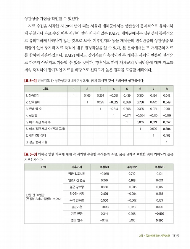 2장 육상생태계와 기후변화 103 상관성을 가짐을 확인할 수 있었다. 자료 수집을 시작한 지 20여 년이 되는 서울대 개체군에서는 상관성이 통계적으로 유의미하 게 관찰되나 자료 수집 이후 시간이 얼마 지나지 않은 KAIST 개체군에서는 상관성이 통계적으 로 유의미하게 나타나지 않는 것으로 보아, 기후인자와 동물 개체군의 번식반응의 상관성을 모 색함에 있어 장기적 자료 축적이 매우 결정적임을 알 수 있다. 본 분석에서는 두 개체군의 자료 를 합하여 사용하였으나, KAIST에서도 장기자료가 축적되면 두 개체군 사이의 반응이 질적으 로 다른지 아닌지도 가늠할 수 있을 것이다. 향후에도 까치 개체군의 번식반응에 대한 자료를 계속 축적하여 장기적인 자료를 바탕으로 신뢰도가 높은 결과를 도출할 계획이다. [표 5-2]...