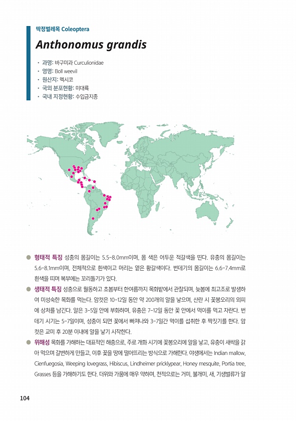 104 ● 형태적 특징 성충의 몸길이는 5.5-8.0mm이며, 몸 색은 어두운 적갈색을 띤다. 유충의 몸길이는 5.6-8.1mm이며, 전체적으로 흰색이고 머리는 옅은 황갈색이다. 번데기의 몸길이는 6.6-7.4mm로 흰색을 띠며 복부에는 꼬리돌기가 있다. ● 생태적 특징 성충으로 월동하고 초봄부터 한여름까지 목화밭에서 관찰되며, 늦봄에 최고조로 발생하 여 미성숙한 목화를 먹는다. 암컷은 10-12일 동안 약 200개의 알을 낳으며, 산란 시 꽃봉오리의 외피 에 상처를 남긴다. 알은 3-5일 안에 부화하며, 유충은 7-12일 동안 꽃 안에서 먹이를 먹고 자란다. 번 데기 시기는 5-7일이며, 성충이 되면 꽃에서 빠져나와 3-7일간 먹이를 섭취한 후 짝짓기를 한다. 암 컷은 교미 후 20분 이내에 알을 낳기 시...