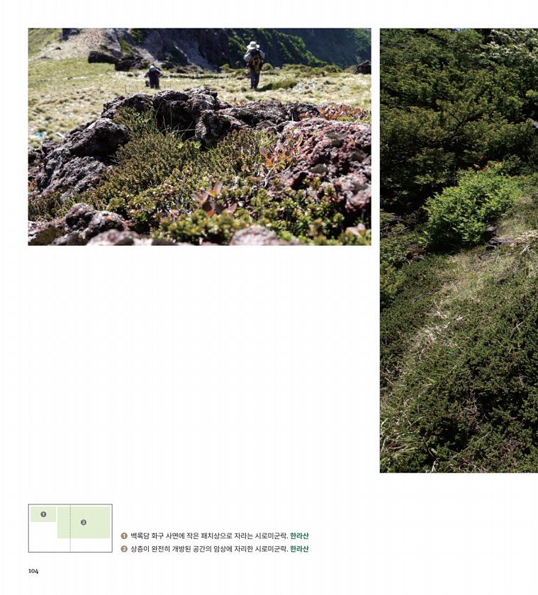 ? ? ? 백록담 화구 사면에 작은 패치상으로 자라는 시로미군락. 한라산 ? 상층이 완전히 개방된 공간의 암상에 자리한 시로미군락. 한라산104