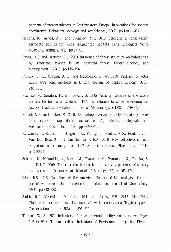 90 patterns of mesocarnivores in Southwestern Europeimplications for species coexistence. Behavioral ecology and sociobiology, 68 9 , pp.1403-1417. Nekaris, K., Arnell, A.P. and Svensson, M.S. 2015. Selecting a conservation surrogate species for small fragmented habitats using Ecological Niche Modelling. Animals, 5 1 , pp.27-40. Payer, D.C. and Harrison, D.J. 2003. Influence of forest structure on...