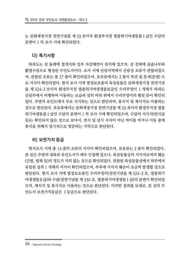 2018 전국 무인도서 자연환경조사 여수 2 94 ? National Institute of Ecology 는 문화재청지정 천연기념물 제 33 호이자 환경부지정 멸종위기야생동물Ⅰ급인 수달의 분변이 1 차 조사 시에 확인되었다. 하과도는 섬 둘레에 절개지와 일부 자갈해안이 위치해 있으며, 섬 전체에 곰솔나무와 활엽수림으로 형성된 무인도서이다. 조사 시에 산림지역에서 산림성 조류가 관찰되었으 며, 관찰된 조류는 총 27 종이 확인되었으며, 포유류에서는 2 종이 목견 및 흔적 분변 으 로 서식이 확인되었다. 현지 조사 시에 법정보호종의 육상동물은 문화재청지정 천연기념 물 제 324-2 호이자 환경부지정 멸종위기야생생물Ⅱ급인 수리부엉이 1 개체가 하과도 산림부에서 비행하여 이동하는 모습과 섬의 바위 위에서 수리부엉...