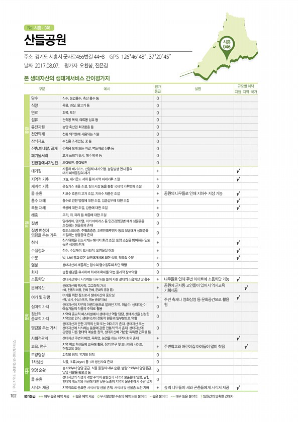 군산 001 No. 시흥 시흥 046 본 생태자산의 생태계서비스 간이평가지 구분 예시 평가 등급 설명 규모별 혜택 지점 지역 국가 공급 담수 식수, 농업용수, 축산 용수 등 0 식량 곡물, 과실, 물고기 등 0 연료 화목, 토탄 0 섬유 건축용 목재, 의류용 섬유 등 0 유전자원 농업·축산업 희귀품종 등 0 천연약재 전통 의약품에 사용되는 식물 0 장식재료 수집용 조개껍질, 꽃 등 0 진흙,미네랄, 골재 건축용 모래 또는 자갈, 벽돌재료 진흙 등 0 폐기물처리 고체 쓰레기 하치, 폐수 방류 등 0 친환경에너지발전 조력발전, 풍력발전 0 조절 대기질 자동차 배기가스, 산업체 대기오염, 농업발생 먼지 등의 대기 미세물질의 제거 + √ 지역적 기후 그늘, 대기온도 저하 등의 지역 미세기후 조절 + √ 세계적 기후...