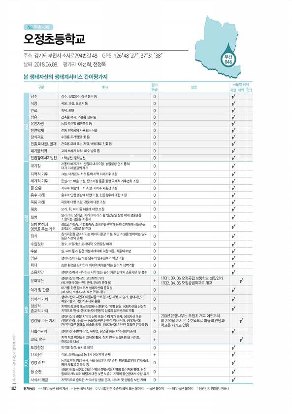 No. 부천- 본 생태자산의 생태계서비스 간이평가지 구분 예시 평가 등급 설명 규모별 혜택 지점 지역 국가 공급 담수 식수, 농업용수, 축산 용수 등 0 √ 식량 곡물, 과실, 물고기 등 0 √ 연료 화목, 토탄 0 √ 섬유 건축용 목재, 의류용 섬유 등 0 √ 유전자원 농업·축산업 희귀품종 등 0 √ 천연약재 전통 의약품에 사용되는 식물 0 √ 장식재료 수집용 조개껍질, 꽃 등 0 √ 진흙,미네랄, 골재 건축용 모래 또는 자갈, 벽돌재료 진흙 등 0 √ 폐기물처리 고체 쓰레기 하치, 폐수 방류 등 0 √ 친환경에너지발전 조력발전, 풍력발전 0 √ 조절 대기질 자동차 배기가스, 산업체 대기오염, 농업발생 먼지 등의 대기 미세물질의 제거 0 √ 지역적 기후 그늘, 대기온도 저하 등의 지역 미세기후 조절 0 √...