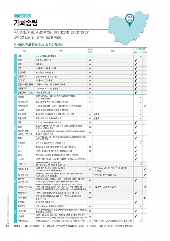 No. 밀양- 본 생태자산의 생태계서비스 간이평가지 구분 예시 평가 등급 설명 규모별 혜택 지점 지역 국가 공급 담수 식수, 농업용수, 축산 용수 등 + √ 식량 곡물, 과실, 물고기 등 0 √ 연료 화목, 토탄 0 √ 섬유 건축용 목재, 의류용 섬유 등 0 √ 유전자원 농업·축산업 희귀품종 등 0 √ 천연약재 전통 의약품에 사용되는 식물 0 √ 장식재료 수집용 조개껍질, 꽃 등 0 √ 진흙,미네랄, 골재 건축용 모래 또는 자갈, 벽돌재료 진흙 등 0 √ 폐기물처리 고체 쓰레기 하치, 폐수 방류 등 0 √ 친환경에너지발전 조력발전, 풍력발전 0 √ 조절 대기질 자동차 배기가스, 산업체 대기오염, 농업발생 먼지 등의 대기 미세물질의 제거 + √ 지역적 기후 그늘, 대기온도 저하 등의 지역 미세기후 조절 ++ ...