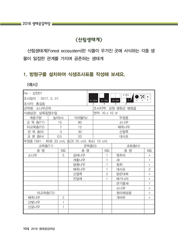 104 2018 생태공감마당 산림생태계 산림생태계 Forest ecosystem 란 식물이 우거진 곳에 서식하는 각종 생 물이 밀접한 관계를 가지며 공존하는 생태계 1. 방형구를 설치하여 식생조사표를 작성해 보세요. 예시 No 갑천01 조사일자 2017. 5. 27. 조사자홍길동 군락명소나무군락 조사지역강원 평창군 평창읍 식생상관상록침엽수림 면적10 x 10 ㎡ 계층구분 높이 m 식피율 % 우점종 교 목 층 T1 15 90 소나무 아교목층 T2 7 15 때죽나무 관 목 층 S 3 30 산철쭉 초 본 층 H 0.5 20 대사초 우점종 DBH 최대 33 cm , 중간 25 cm , 최소 10 cm 교목층 T1 관목층 S 초본층 H 종 명 피도 종 명 피도 종 명 피도 소나무 5 감태나무 1 원추리 + 개옻나무 ...