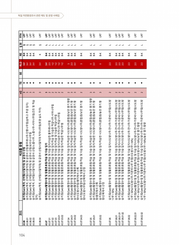 독일 자연환경조사 관련 제도 및 운영 사례집 코드 비오톱 유형 nG TE SE RLD RE § 30 FFH 43.06 습지림 Carr /계곡, 산비탈 너덜지대 및 급경사 산림 3 ? 3-V B-K § LRT 43.06.01 습지림 Carr /계곡, 산비탈 너덜지대 및 급경사 산림/물푸레나무-단풍나무림 습하고 추운 입지 3 ? 3-V B-K § LRT 43.06.02 습지림 Carr /계곡, 산비탈 너덜지대 및 급경사 산림/보리수나무림 3 ? 3-V B-K § LRT 43.06.03 습지림 Carr /계곡, 산비탈 너덜지대 및 급경사 산림/느릅나무, 느릅나무-서어나무림 건조 및 적습 입지 3 ? 3-V B-K § LRT 43.06.04 습지림 Carr /계곡, 산비탈 너덜지대 및 급경사 산림/너덜지대 자작나무...