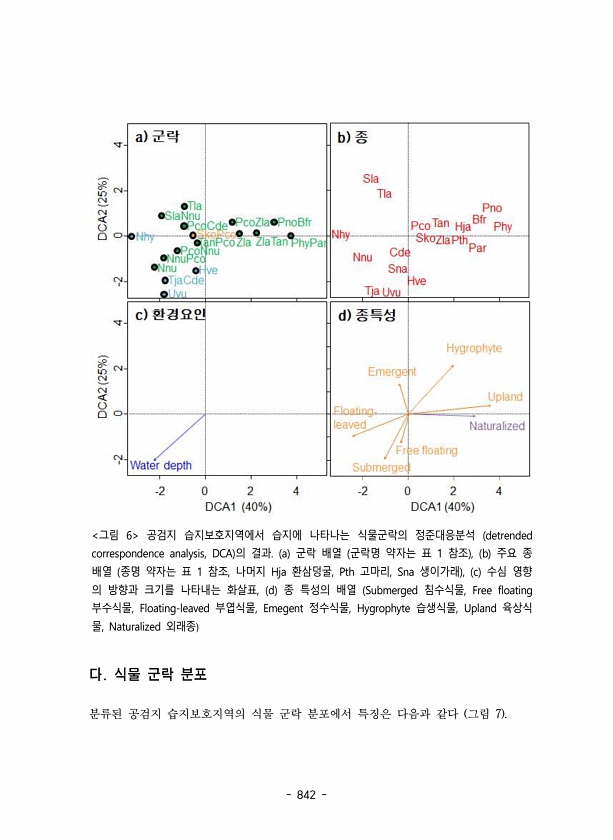 842 그림 6 공검지 습지보호지역에서 습지에 나타나는 식물군락의 정준대응분석 detrended correspondence analysis, DCA 의 결과. a 군락 배열 군락명 약자는 표 1 참조 , b 주요 종 배열 종명 약자는 표 1 참조, 나머지 Hja 환삼덩굴, Pth 고마리, Sna 생이가래 , c 수심 영향 의 방향과 크기를 나타내는 화살표, d 종 특성의 배열 Submerged 침수식물, Free floating 부수식물, Floating-leaved 부엽식물, Emegent 정수식물, Hygrophyte 습생식물, Upland 육상식 물, Naturalized 외래종 다. 식물 군락 분포 분류된 공검지 습지보호지역의 식물 군락 분포에서 특징은 다음과 같다 그림 7