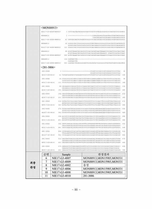 90 MON88913 281-3006 최종 판정 순번 Sample 판정결과 6 NIE17-G3-4007 MON88913,MON15985,MON531 7 NIE17-G3-4009 MON88913,MON15985,MON531 8 NIE17-G2-4002 음성 9 NIE17-G3-4006 MON88913,MON15985,MON531 10 NIE17-G3-4008 MON88913,MON15985,MON531 11 NIE17-G3-4010281-3006