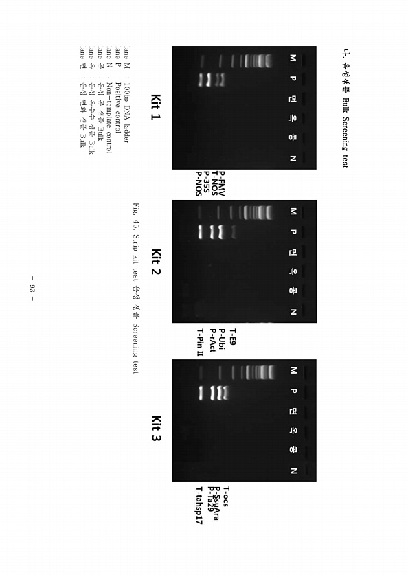 93 나. 음성샘플 Bulk Screening test Fig. 45. Strip kit test 음성 샘플 Screening test lane M 100bp DNA ladder lane P Positive control lane N Non-template control lane 콩 음성 콩 샘플 Bulk lane 옥 음성 옥수수 샘플 Bulk lane 면 음성 면화 샘플Bulk