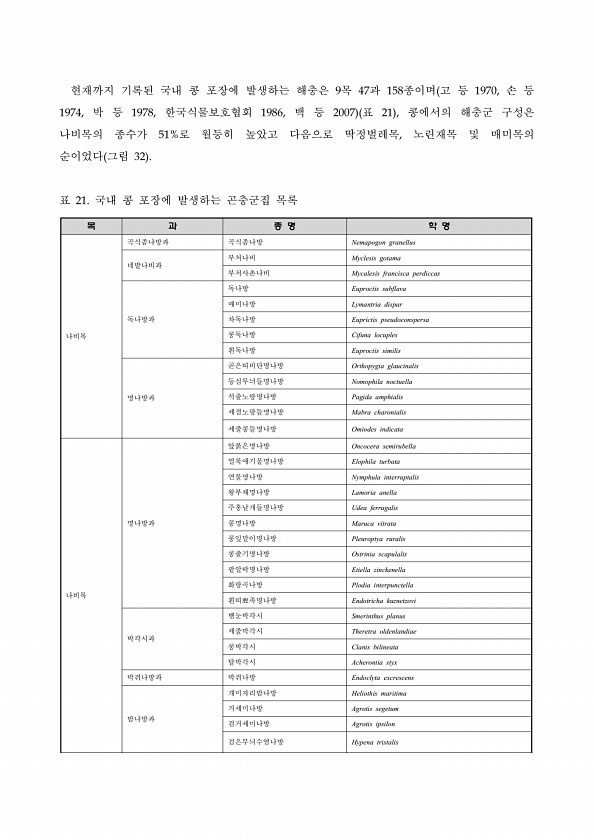 목 과 종 명 학 명 나비목 곡식좀나방과 곡식좀나방 Nemapogon granellus 네발나비과 부처나비 Myclesis gotama 부처사촌나비 Mycalesis francisca perdiccas 독나방과 독나방 Euproctis subflava 매미나방 Lymantria dispar 차독나방 Euprictis pseudoconspersa 콩독나방 Cifuna locuples 흰독나방 Euproctis similis 명나방과 곧은띠비단명나방 Orthopygia glaucinalis 등심무늬들명나방 Nomophila noctuella 석줄노랑명나방 Pagida amphialis 세점노랑들명나방 Mabra charonialis 세줄콩들명나방 Omiodes indicata 나비목 명나방과 앞붉은명나방 Onc...