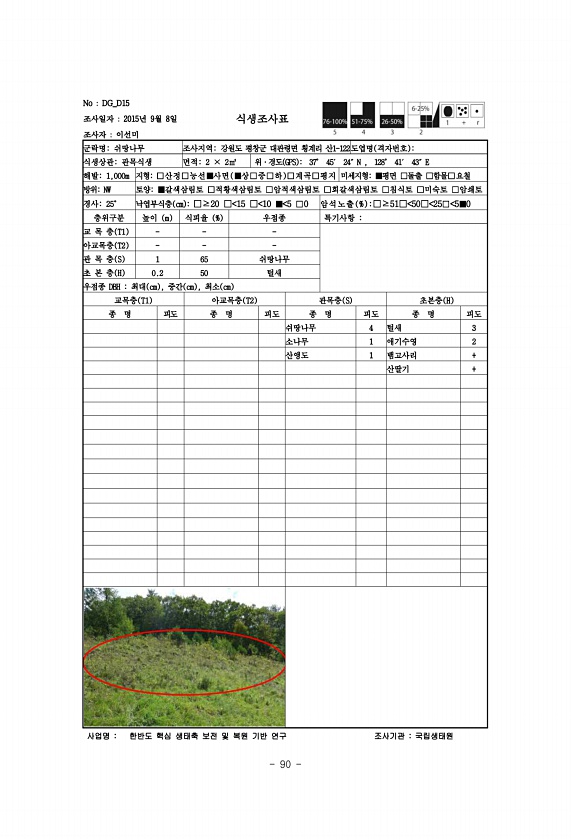 90 No DG_D15 조사일자 2015년 9월 8일 조사자 이선미 식생조사표 군락명쉬땅나무 조사지역강원도 평창군 대관령면 횡계리 산1-122도엽명 격자번호 식생상관관목식생 면적2 × 2㎡ 위·경도 GPS 37° 45′ 24″N , 128° 41′ 43″E 해발1,000m 지형□산정□능선■사면 ■상□중□하 □계곡□평지 미세지형■평면 □돌출 □함몰□요철 방위NW 토양■갈색삼림토 □적황색삼림토 □암적색삼림토 □회갈색삼림토 □침식토 □미숙토 □암쇄토 경사25° 낙엽부식층 cm □≥20 □ 15 □ 10 ■ 5 □0 암석노 출 % □≥51□ 50□ 25□ 5■0 층위구분 높이 m 식피율 % 우점종 특기사항 교 목 층 T1 아교목층 T2 관 목 층 S 1 65 쉬땅나무 초 본 층 H 0.2 50 털새 우점종 DBH ...