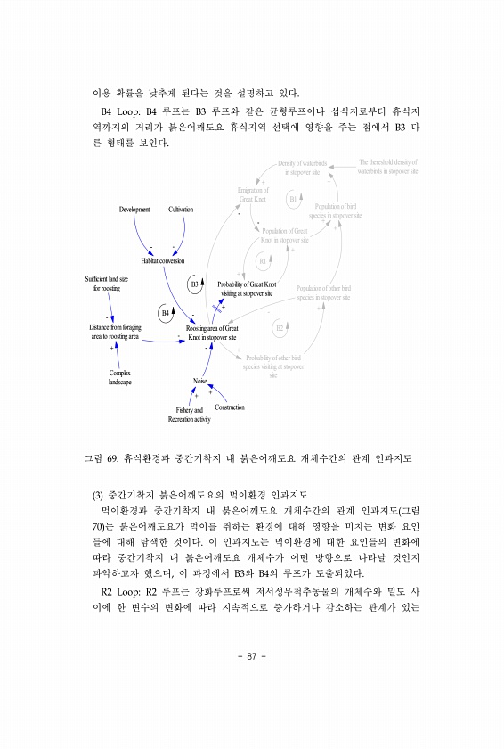 87 이용 확률을 낮추게 된다는 것을 설명하고 있다. B4 LoopB4 루프는 B3 루프와 같은 균형루프이나 섭식지로부터 휴식지 역까지의 거리가 붉은어깨도요 휴식지역 선택에 영향을 주는 점에서 B3 다 른 형태를 보인다. Density of waterbirds in stopover site Population of bird species in stopover site Emigration of Great Knot Population of Great Knot in stopover site Probability of Great Knot visiting at stopover site Roosting area of Great Knot in stopover site Probability of other bird spe...