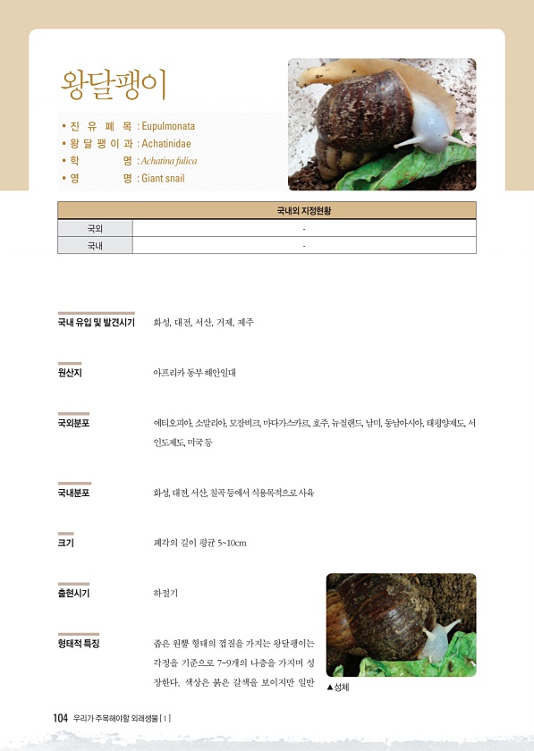 104 우리가 주목해야할 외래생물 [Ⅰ] 국내 유입 및 발견시기 화성, 대전, 서산, 거제, 제주 원산지 아프리카 동부 해안일대 국외분포 에티오피아, 소말리아, 모잠비크, 마다가스카르, 호주, 뉴질랜드, 남미, 동남아시아, 태평양제도, 서 인도제도, 미국 등 국내분포 화성, 대전, 서산, 칠곡 등에서 식용목적으로 사육 크기 폐각의 길이 평균 510cm 출현시기 하절기 형태적 특징 좁은 원뿔 형태의 껍질을 가지는 왕달팽이는 각정을 기준으로 79개의 나층을 가지며 성 장한다. 색상은 붉은 갈색을 보이지만 일반 ? 진 유 폐 목 Eupulmonata ? 왕 달 팽 이 과 Achatinidae ? 학 명 Achatina fulica ? 영 명 Giant snail 국내외 지정현황 국외 국내 왕달팽이▲성체