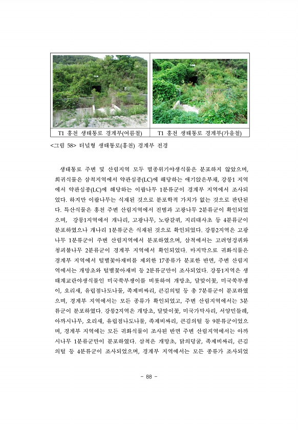 88 T1 홍천 생태통로 경계부 여름철 T1 홍천 생태통로 경계부 가을철 그림 58 터널형 생태통로 홍천 경계부 전경 생태통로 주변 및 산림지역 모두 멸종위기야생식물은 분포하지 않았으며, 희귀식물은 삼척지역에서 약관심종 LC 에 해당하는 애기앉은부채, 강릉1 지역 에서 약관심종 LC 에 해당하는 이팝나무 1분류군이 경계부 지역에서 조사되 었다. 하지만 이팝나무는 식재된 것으로 분포학적 가치가 없는 것으로 판단된 다. 특산식물은 홍천 주변 산림지역에서 진범과 고광나무 2분류군이 확인되었 으며, 강릉1지역에서 개나리, 고광나무, 노랑갈퀴, 지리대사초 등 4분류군이 분포하였으나 개나리 1분류군은 식재된 것으로 확인되었다. 강릉2지역은 고광 나무 1분류군이 주변 산림지역에서 분포하였으며, 삼척에서는 고려엉겅퀴와 청...